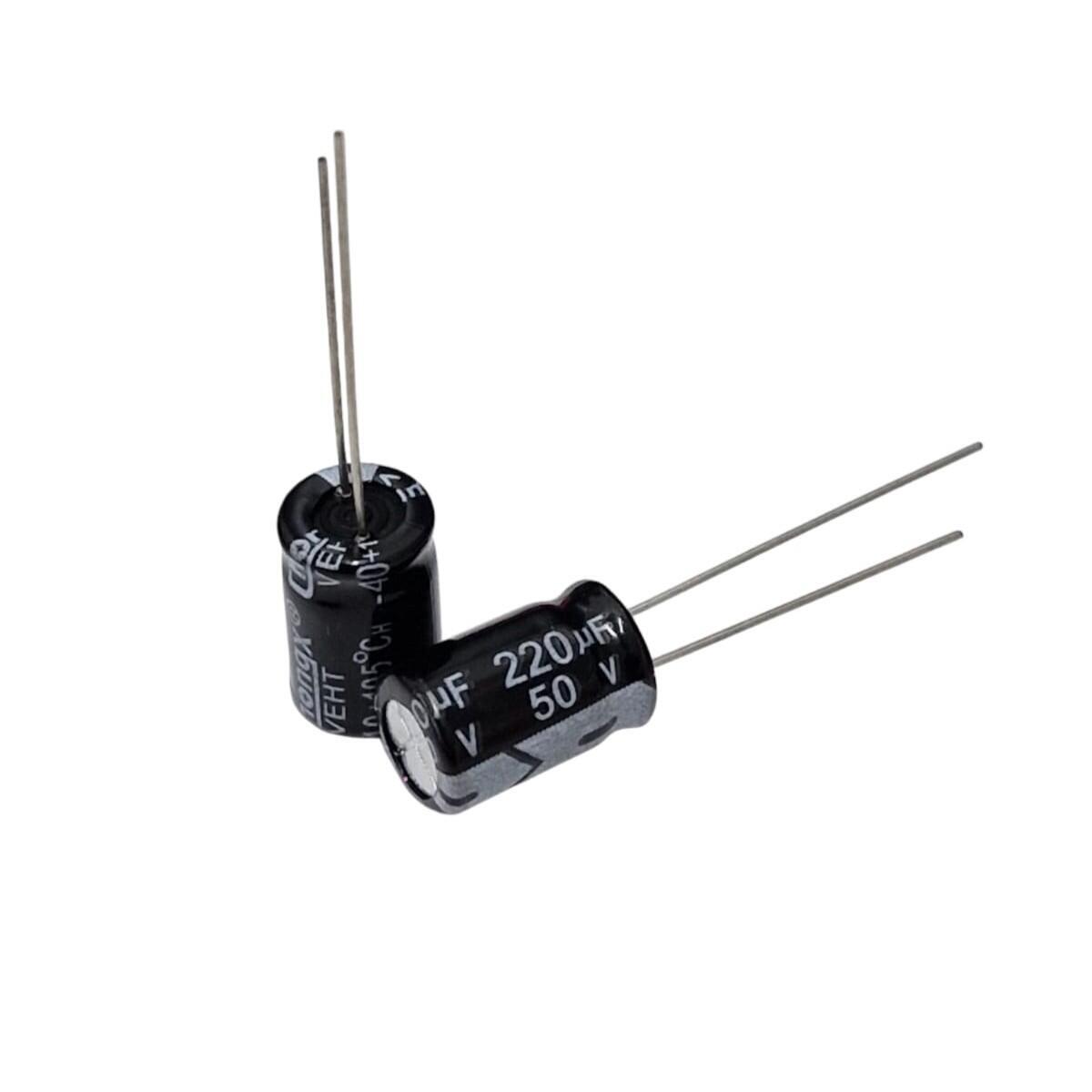 capacitores eletrolíticos de 220 F e 50 V (temperatura de trabalho de 40 C a 105 C, tamanho 8×12 mm), ideais para filtragem, estabilização de tensão e desacoplamento em fontes de alimentação, amplificadores, conversores e diversos circuitos eletrônicos; esses capacitores oferecem excelente desempenho em aplicações de média energia, ajudam a reduzir ruídos e flutuações na linha, são compactos e fáceis de instalar, e perfeitos tanto para uso profissional quanto para projetos DIY, manutenção e reposição, proporcionando confiabilidade e ótimo custo-benefício.