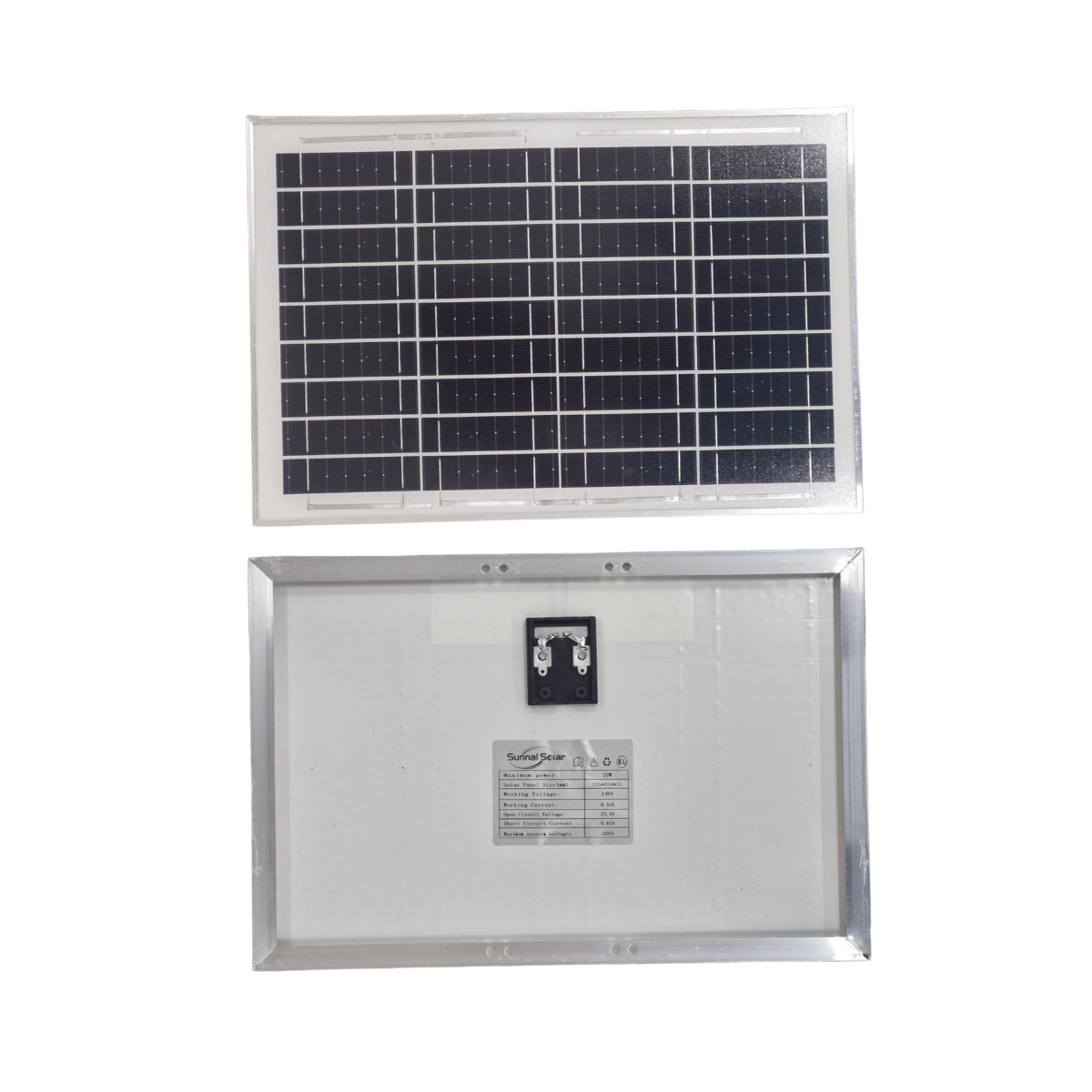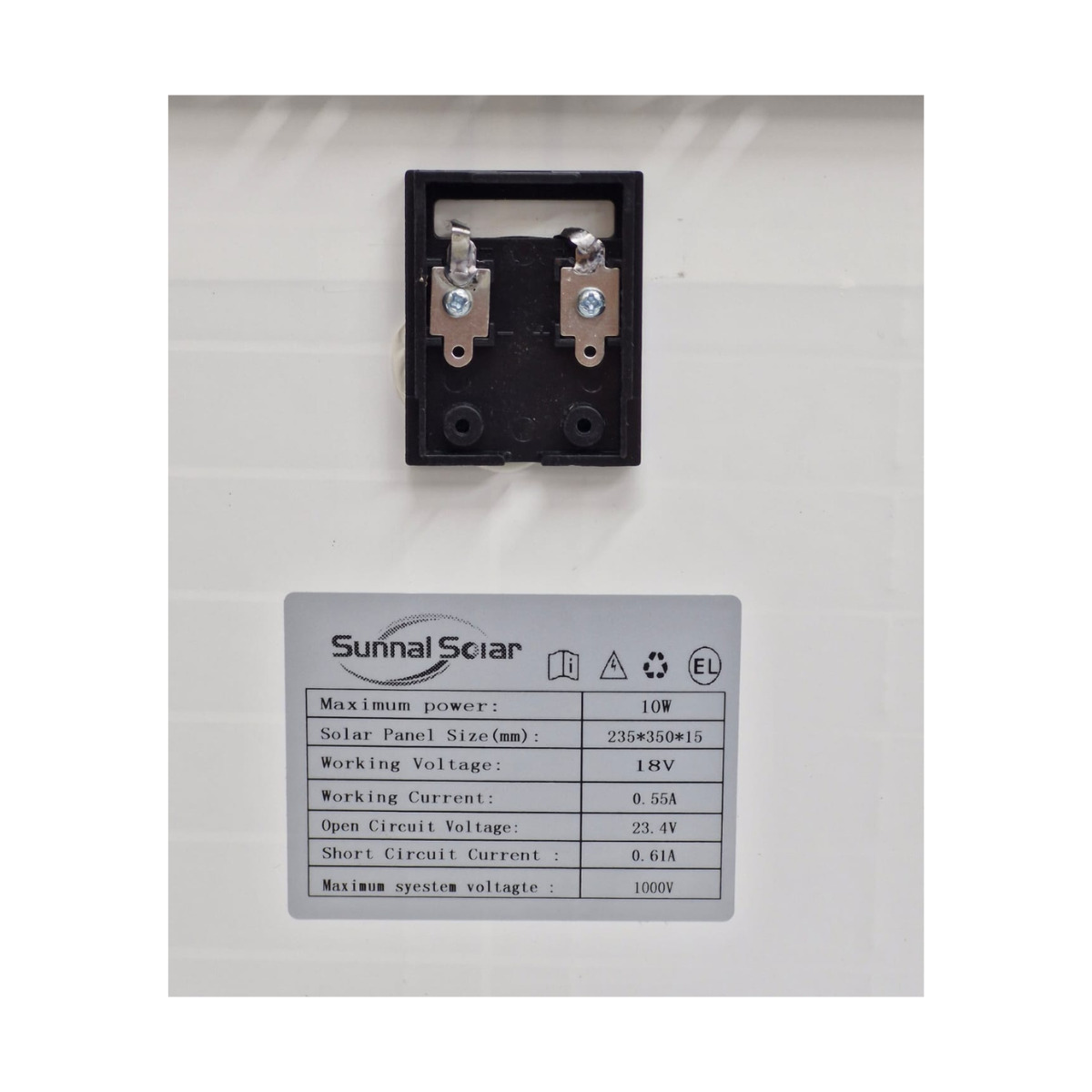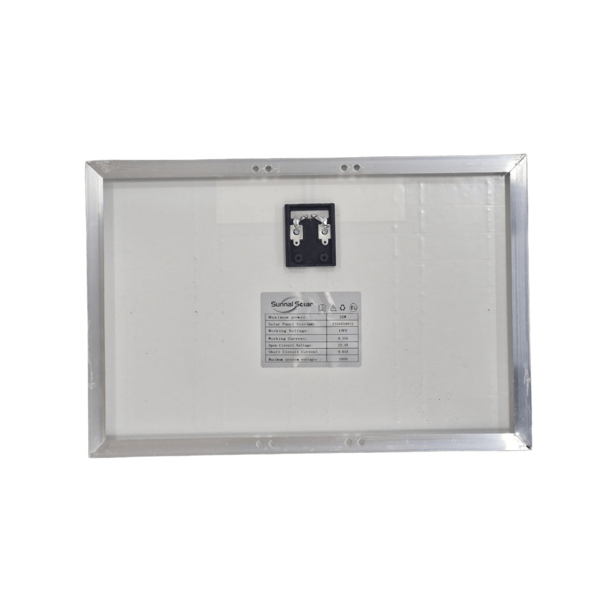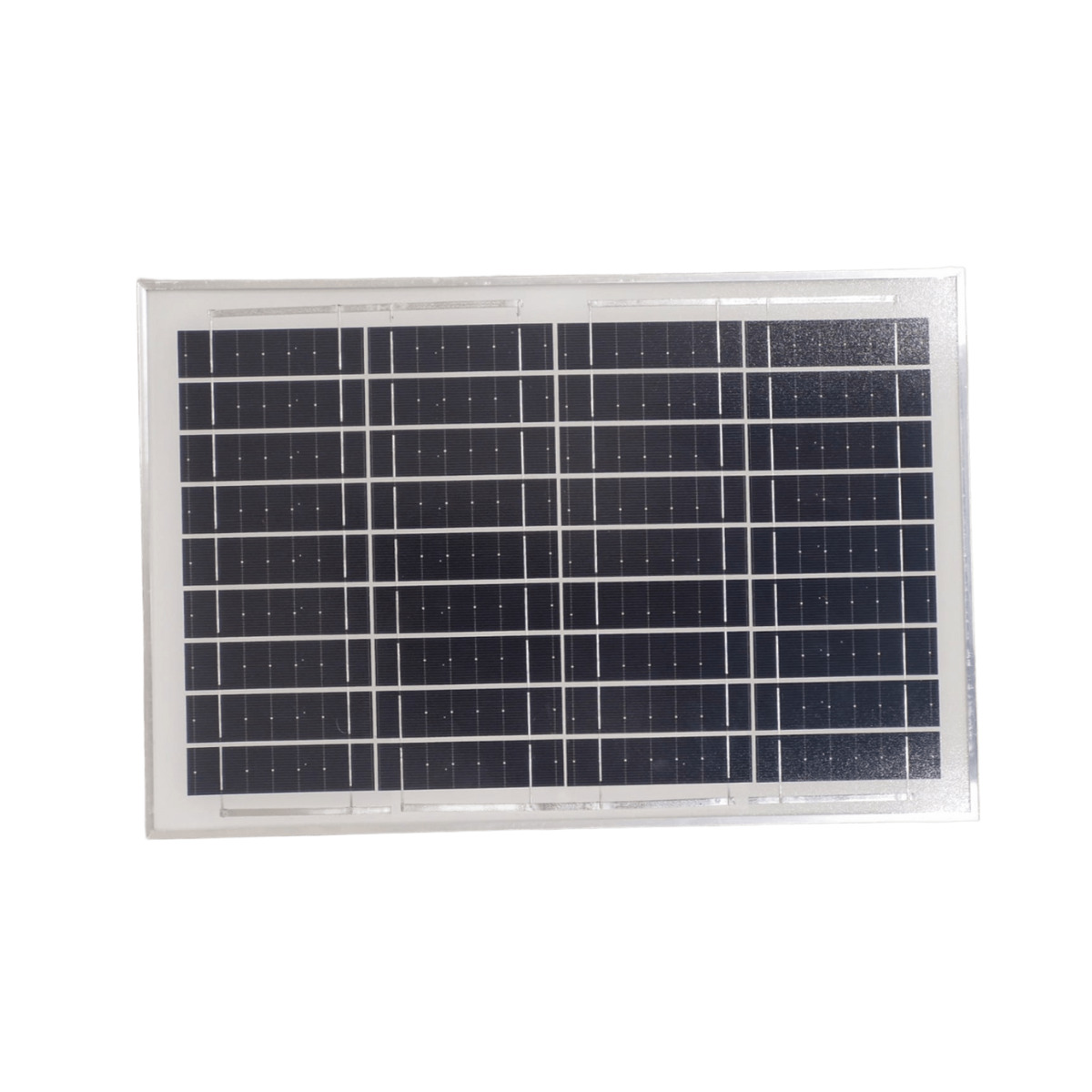 Painel/placa de energia solar fotovoltaica de 10 W e 18 V ideal para captar a energia do sol e gerar eletricidade em pequenos sistemas off-grid e aplicações de baixa potência; esse módulo solar policristalino é compacto e resistente, com tensão máxima do sistema de até 1000 V e excelente desempenho em condições normais de uso, sendo perfeito para alimentar projetos solares, iluminação, bombas pequenas e manutenção de baterias em locais remotos ou sem rede elétrica.